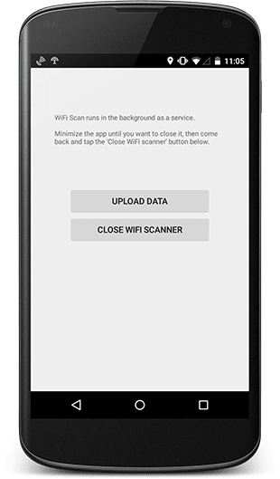 On the surface the app has two buttons; "Close WiFi scanner" and "Upload data". Behind the scenes it's only a little cooler. Upon opening the app it starts a background service that hooks into the phones location services - this covers GPS and network location methods - and listens for updates or movements. After testing different movement configurations I decided to use a minimum of 10 meters or 5 seconds since the last update.